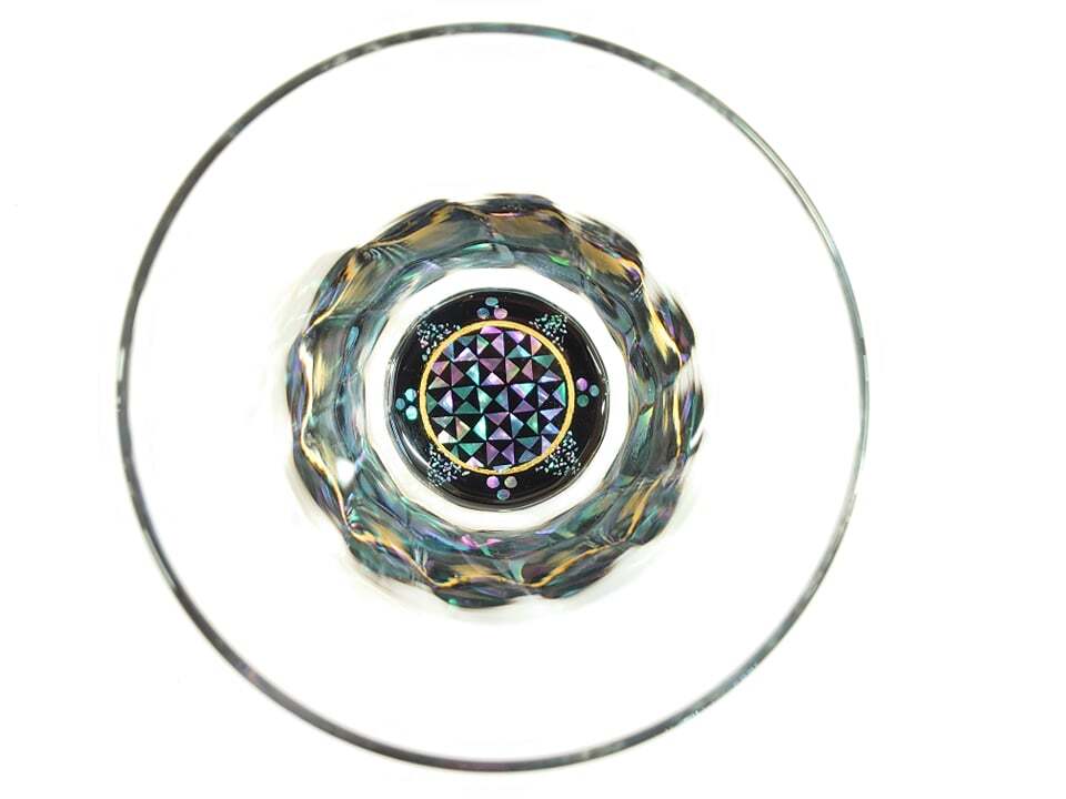 大正2年創業より培ってきて佛檀制作の技術を応用し、グラスに本漆、純金箔、螺鈿(らでん:アワビ貝)を施して完成させました。金箔の輪っかの中に湧泉をイメージした螺鈿を施し、その外側に溢れ出した水を模した螺鈿を散りばめて施しました。壮大な立山連峰より湧き出る、水資源が豊富な富山県魚津市を表現した逸品です。