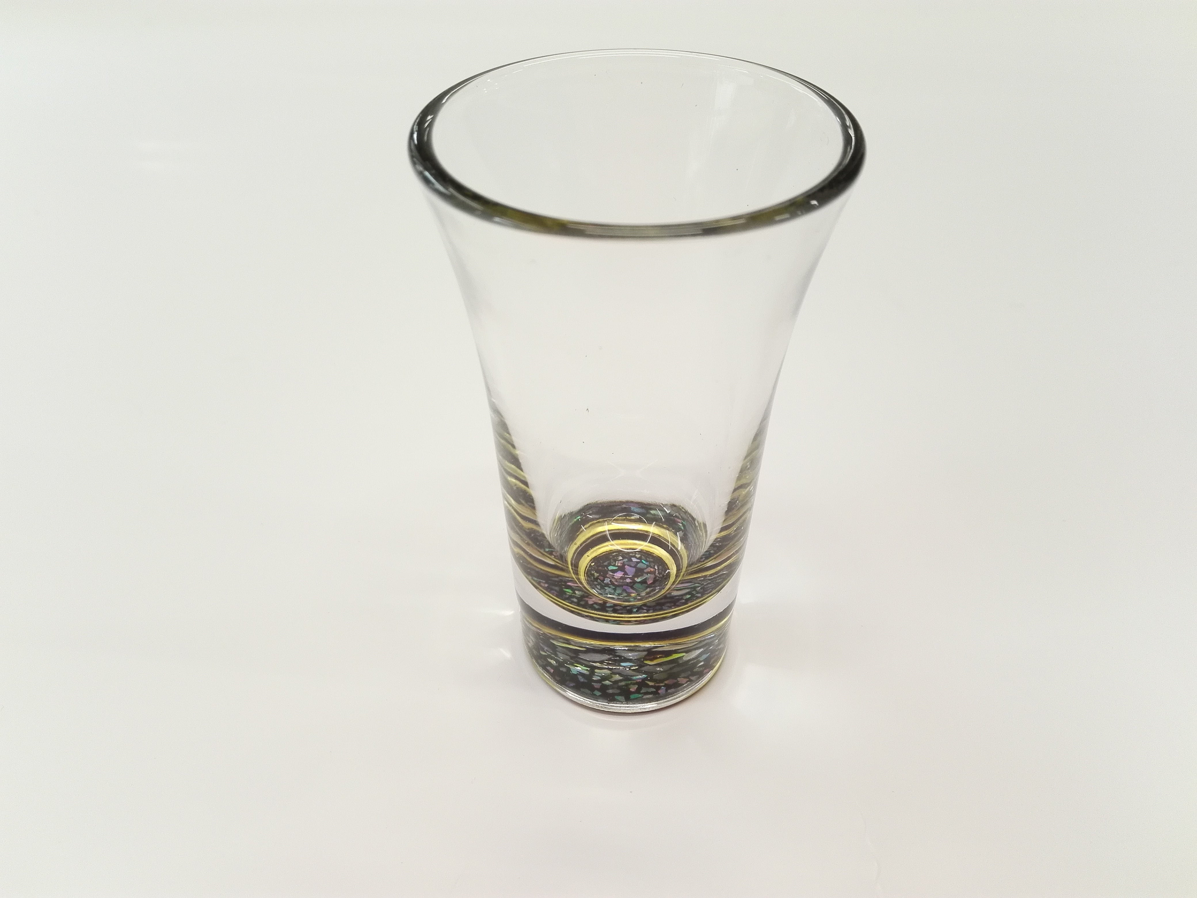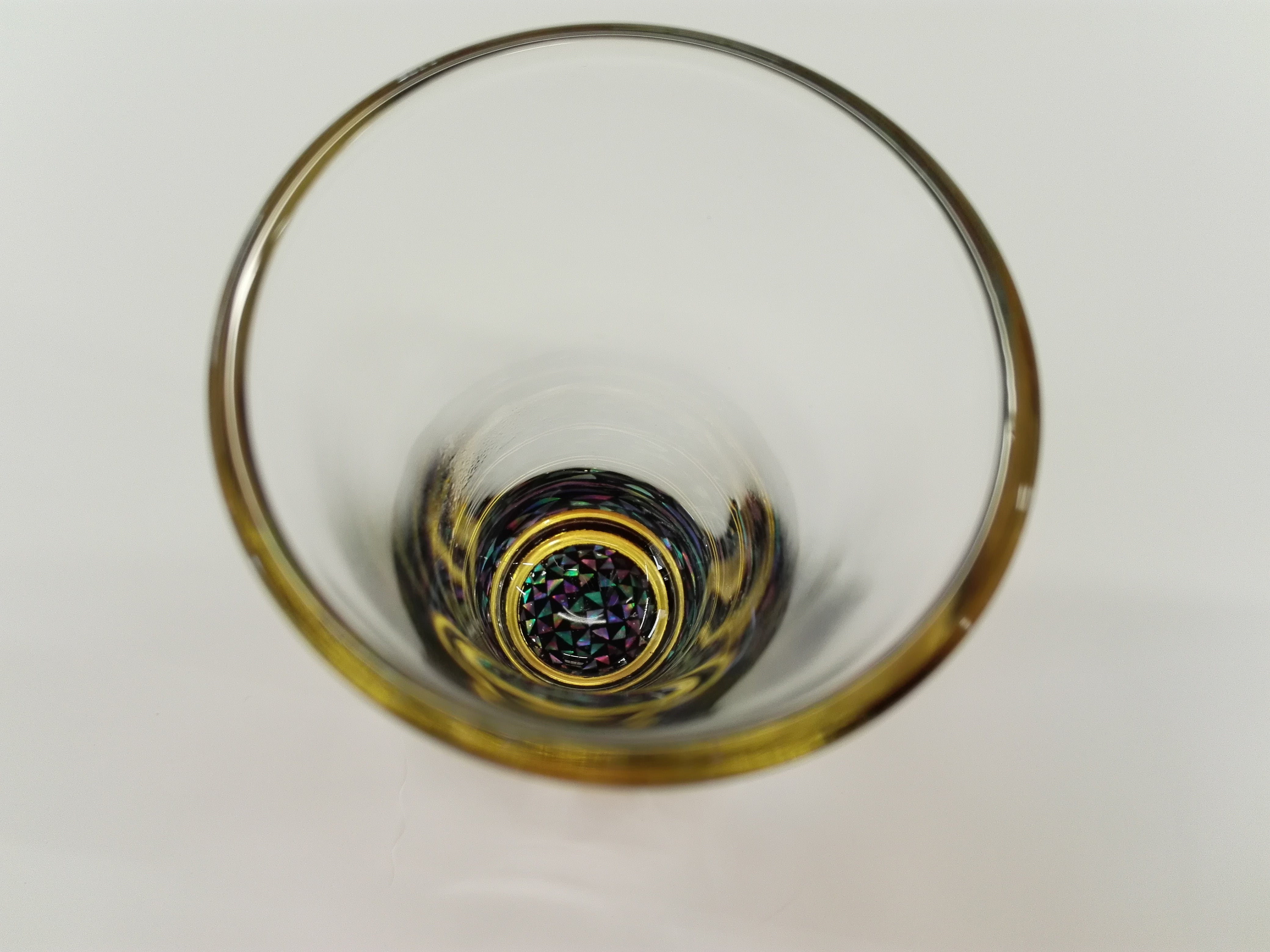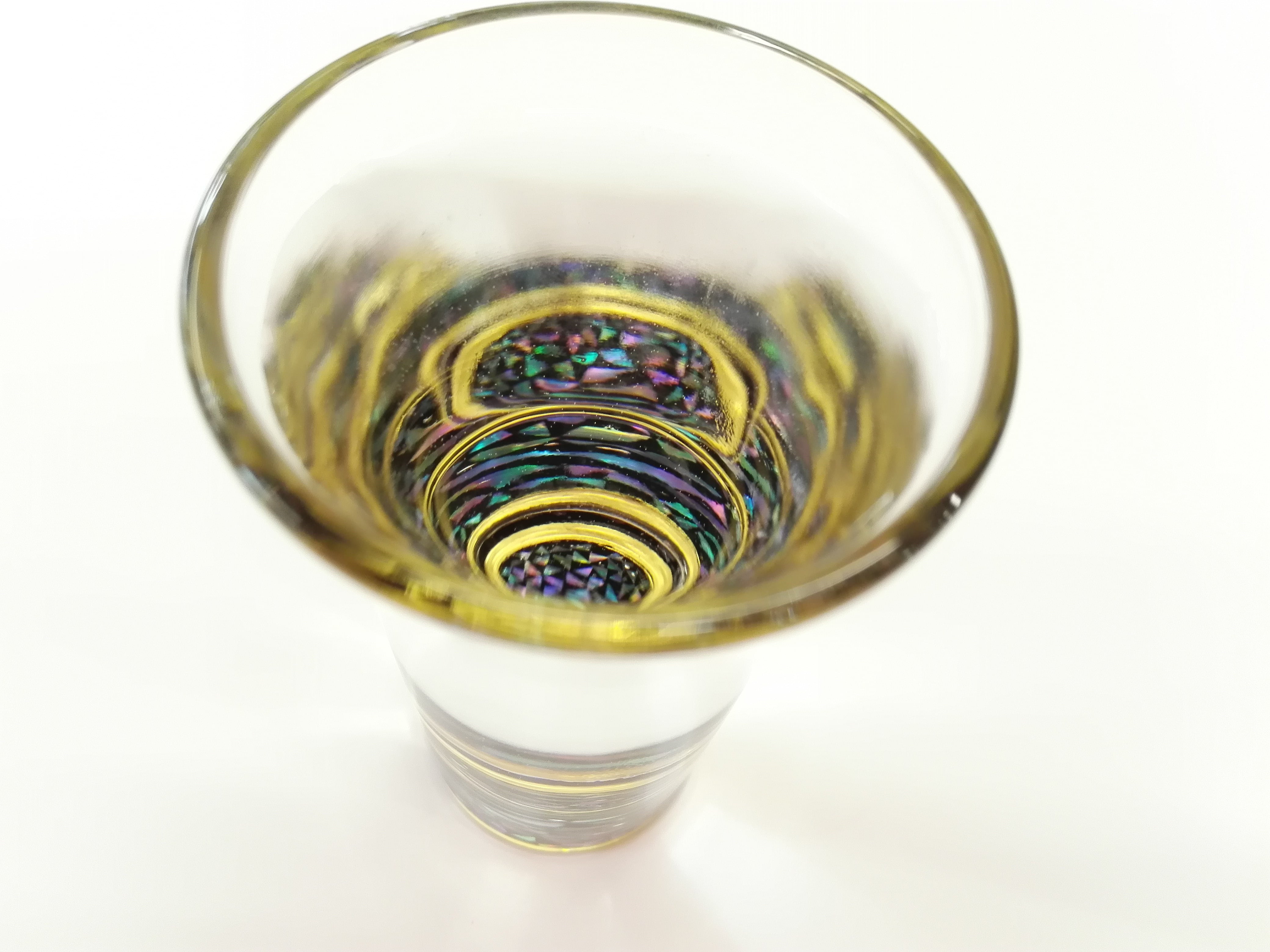 大正2年創業の老舗佛檀屋の技術を駆使しました。金箔・銀箔・銅箔を用いた、幻想的な本漆螺鈿お猪口です。400年続く魚津漆器の技術を伝承している、漆塗り職人、加飾職人、金箔押し職人の技が融合したこの返礼品。見た目もとても幻想的なのですが、これにお水や白ワインなどを注ぎ込むと、グラスの底に施された螺鈿・本漆の雅な模様に加え、金箔の模様が何重もの輪っかとなって現れます。